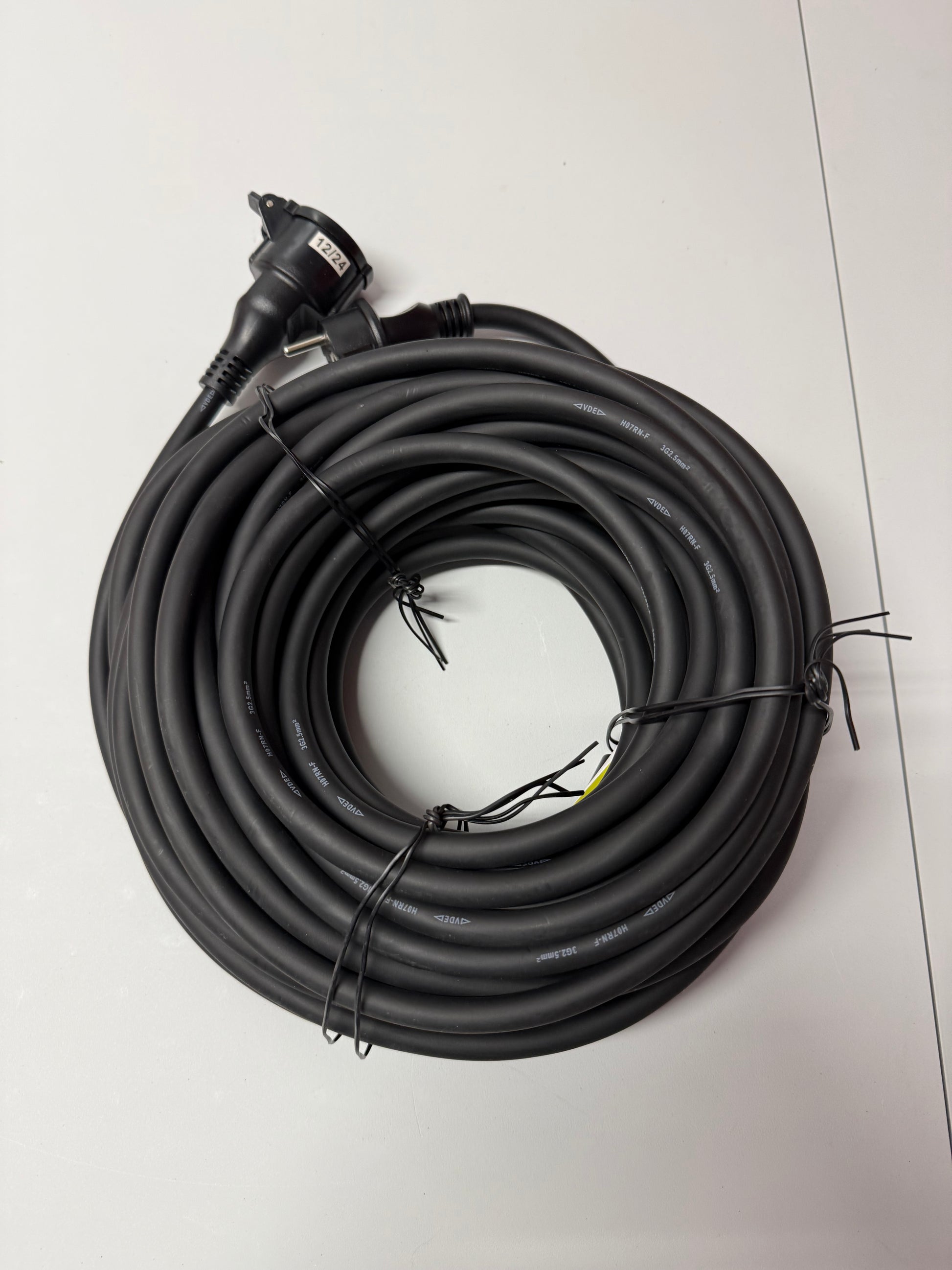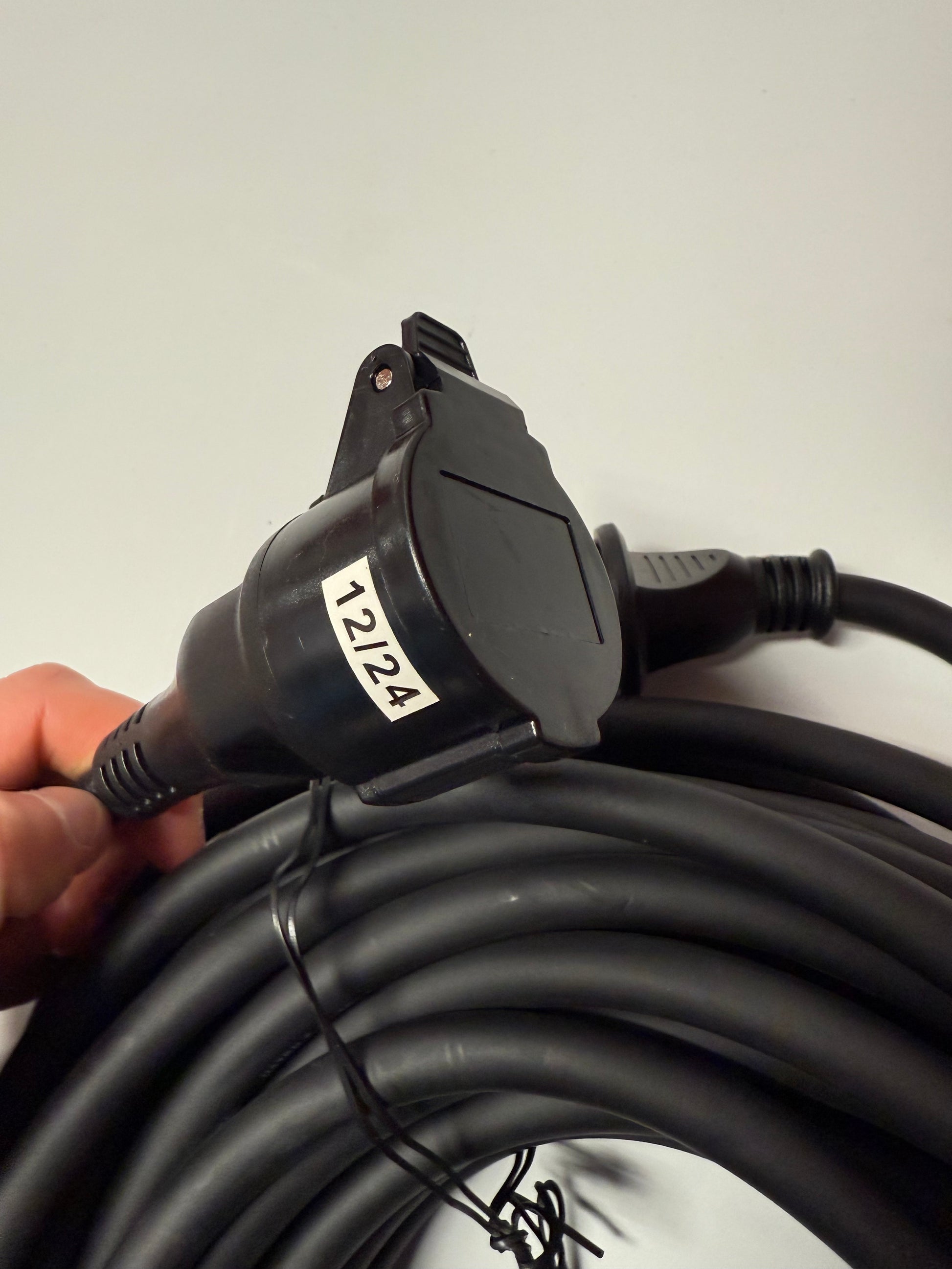 Skjøtekabel for utendørsbruk med jord. 1-veis, med lokk. Kabelen har en lengde på 20 meter. Håndterer opptil 3500W.